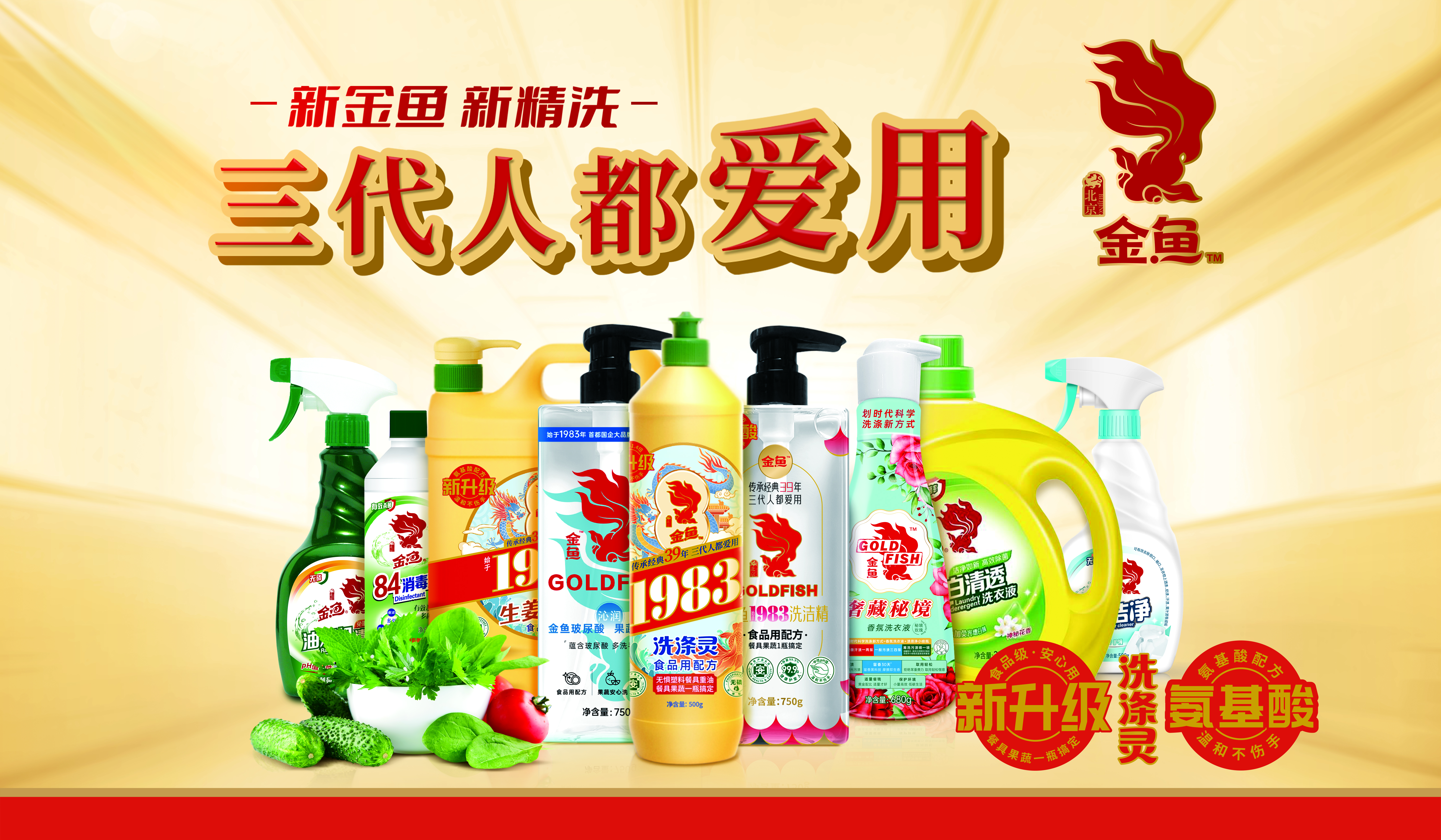 如今,金鱼的产品已由单一的液体洗涤民用产品发展成多元化产品群,已发展成拥有100多个品种的系列化家族,涵盖了餐具洗涤剂、家用厨房清洗剂、卫生间洗涤剂、居室用洗涤剂、衣物用清洗剂等多种专用洗涤系列产品。