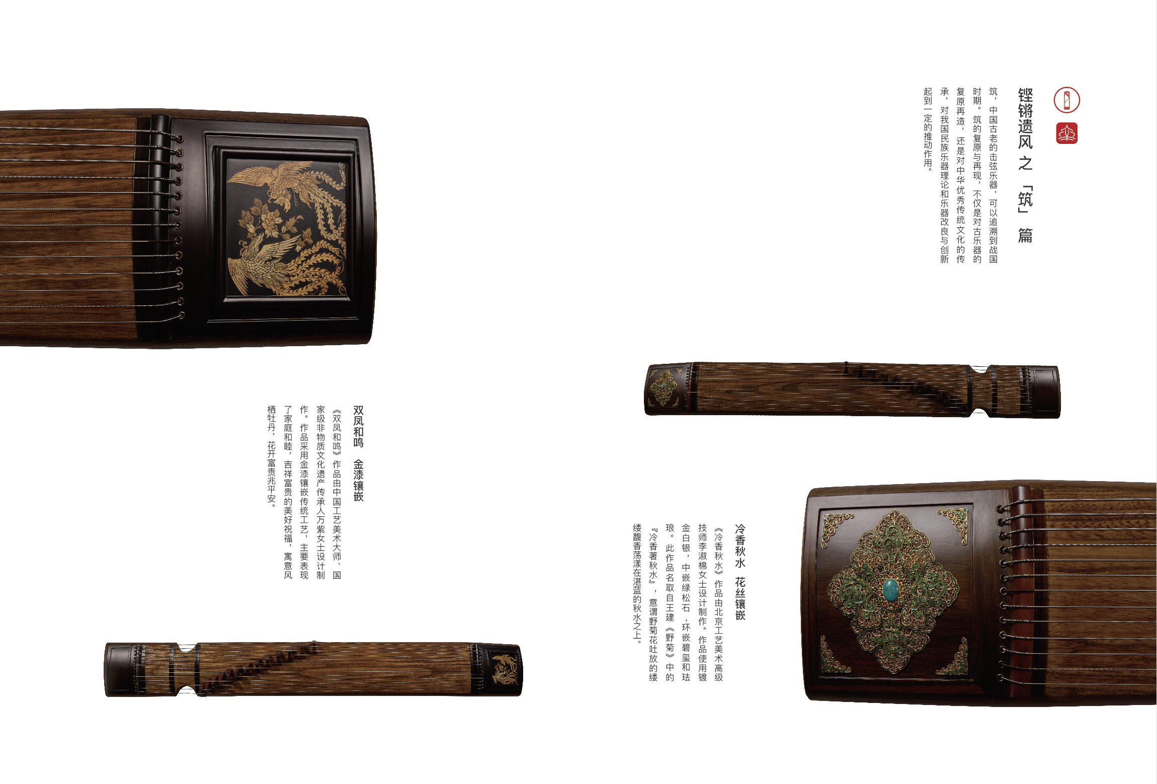 在此领域,北京乐器研究所的古乐器研究学者彭丽颖女士无疑是杰出的代表。她深耕古乐器复原领域二十余年,以《乐书》《唐乐图》等珍贵古籍为蓝本,巧妙融合3D扫描、声学建模等前沿科技手段,成功完成了唐代轧筝、宋代筑、瑟等十余种失传乐器的系统性复原工程,填补了古代音乐考古领域的空白,让千年古韵在现代社会中重焕生机。在复原实践中,彭丽颖团队更是创造性地研发出具有自主知识产权的古乐器复原体系。针对筑与轧筝这两类珍贵的古乐器,他们匠心独运地打造出涵盖燕京八绝、国色、国潮三大文化主题的系列产品矩阵。该系列包括大筑、小筑、大轧筝、小轧筝四种形制,每一件作品都采用了非遗髹饰技艺精心手工制作,琴体上镶嵌着螺钿、雕漆等传统工艺元素,既精准复原了古乐器“中虚外实”的声学特质,又巧妙融入了当代审美意趣,使这些作品兼具了演奏功能与艺术收藏价值,成为民族乐器文化宝库中的璀璨明珠。