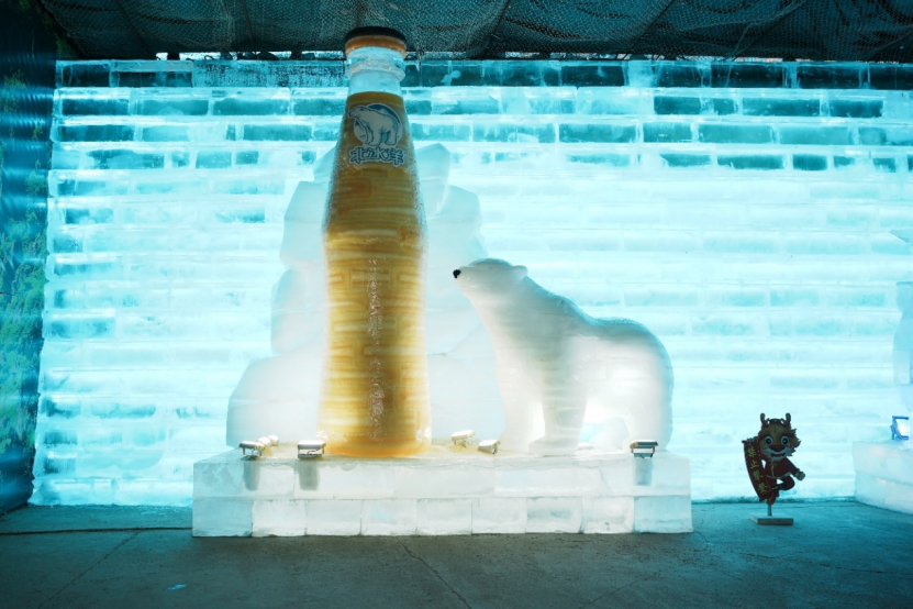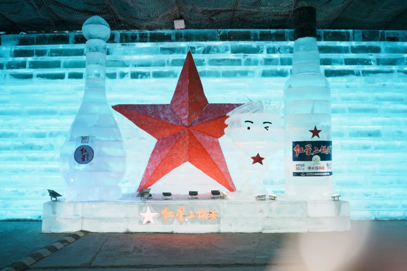 北冰洋打造的透彩巨型冰雕格外吸睛,憨态可掬的“冰冰熊”搭配北冰洋经典玻璃瓶造型,冰体清透莹润,辅以多彩光影效果,夜色中熠熠生辉,成为龙庆峡最受欢迎的打卡地之一,游客们纷纷驻足拍照留念。红星则以“红星精灵+经典产品”为主题打造双重冰雕作品,灵动的精灵形象与经典产品造型交相辉映,结合声光电技术,打造出沉浸式十足的冬日幻境,让游客在冰雪中感受老字号的全新魅力。