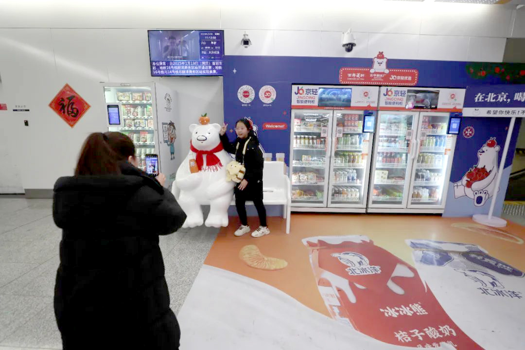 冰冰熊塑像、国潮范背景板、明星产品地板胶、超大号国门LED展示屏等,在有着“国门地铁站”美誉的大兴机场站进站口,现场十余平米的便利柜贩售区,聚集了大量少男少女,争相与冰冰熊拍照留念。工作人员介绍,为讲好义利、北冰洋这些老字号品牌故事,有效吸引年轻人,本次一轻食品集团一改常规裸柜售卖方式,通过前期对现场十余平方米售卖区多次设计规划,我们最终决定要充分挖掘利用点位特点,将其打造为年轻人喜闻乐见的国潮打卡地,激发出老字号的新活力。“冰冰熊作为北冰洋的品牌IP,是首次在城市地铁站中亮相,目前冰冰熊每天旅客合影量可达30次以上,深受小朋友喜欢。”工作人员说道。