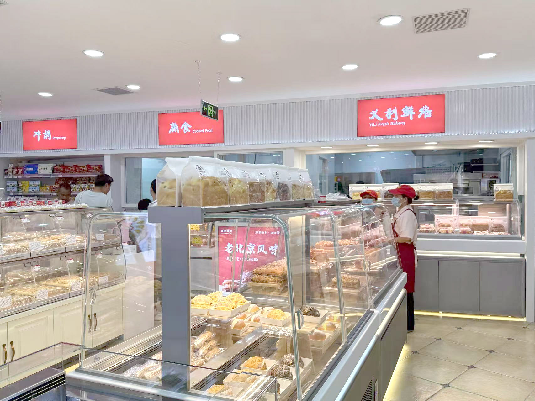 空间体验在经典怀旧中焕然一新。步入焕然一新的幸福大街店,百年义利标志性的红黄元素依然醒目,传承着不变的品牌基因,为迎合现代审美,门店在灯光、墙体、外部设计上,采用简约明快的设计风格,将百年义利传统元素与现代美学完美融合,功能分区规划更加科学合理,既增设现烤烘焙区和新品外露区,又将经典产品展售区进行多功能空间划分。极大提升了顾客的选购便捷度,义利、双合盛、北冰洋、红星、龙徽等北京一轻经典品牌丰富的经典产品集中呈现,尽显老字号魅力。